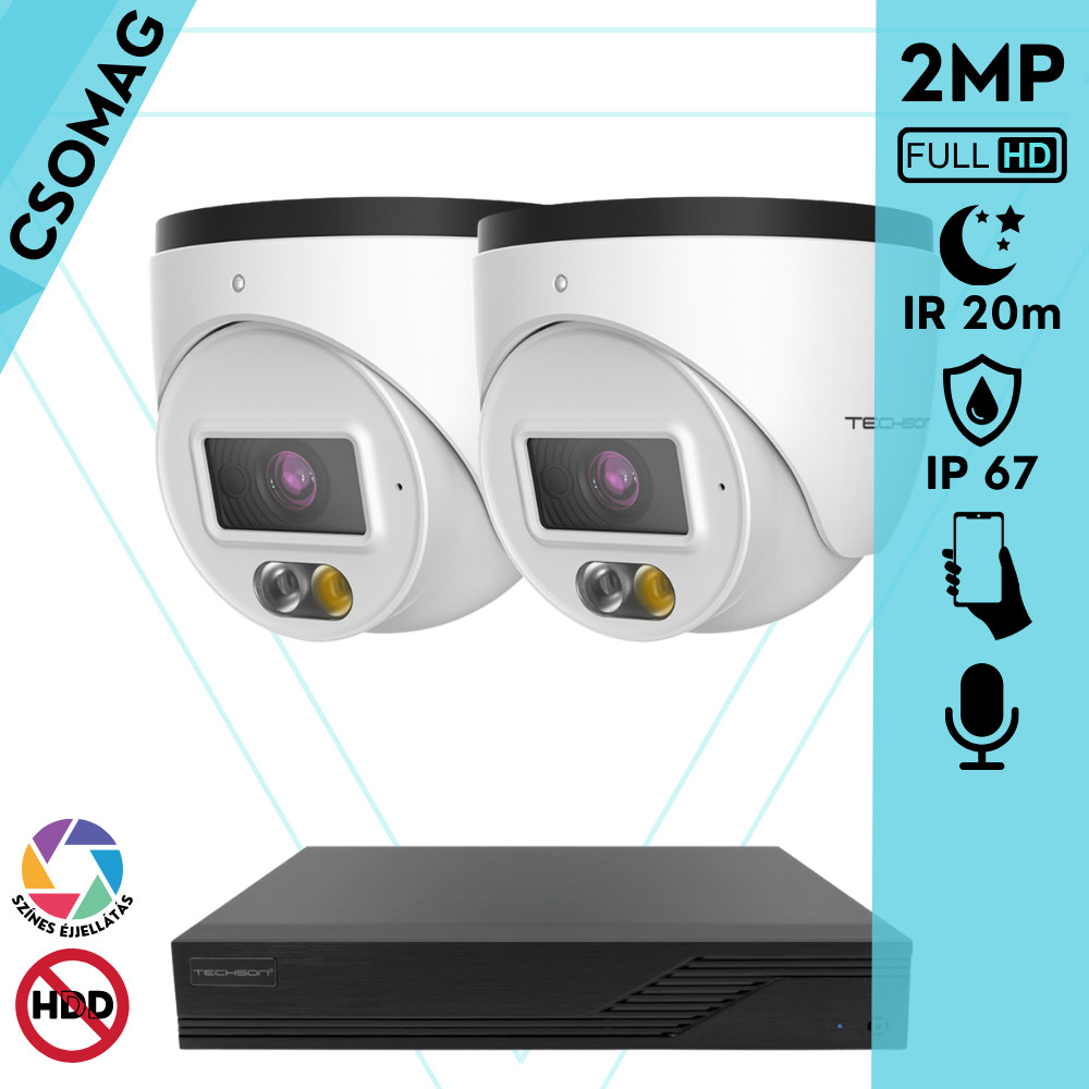 Techson 2 turret kamerás IP megfigyelőrendszer 2MP HD turret biztonsági kamera, 2.8 mm-es fix objektívvel, PoE, beépített mikrofonnal, hibrid fényű megvilágítás, kültéri, fém ház
